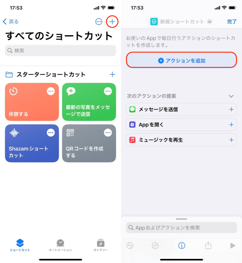 (左)快捷方式选项卡上的 + 图标 (右)添加操作