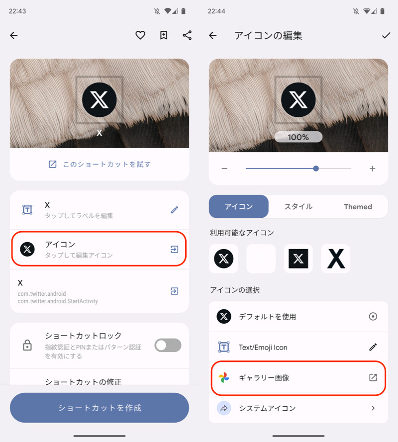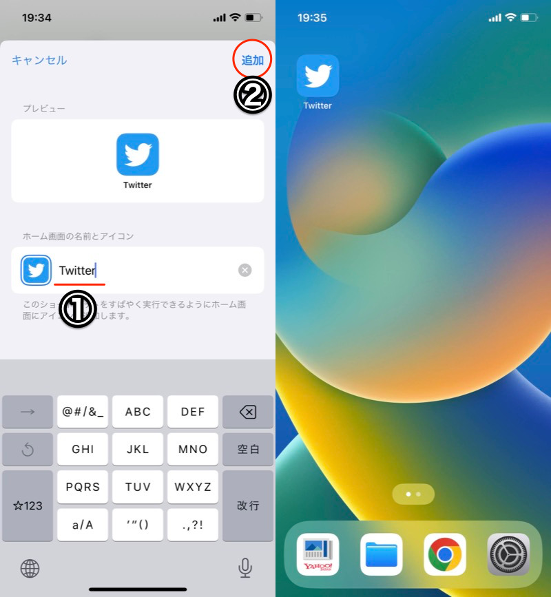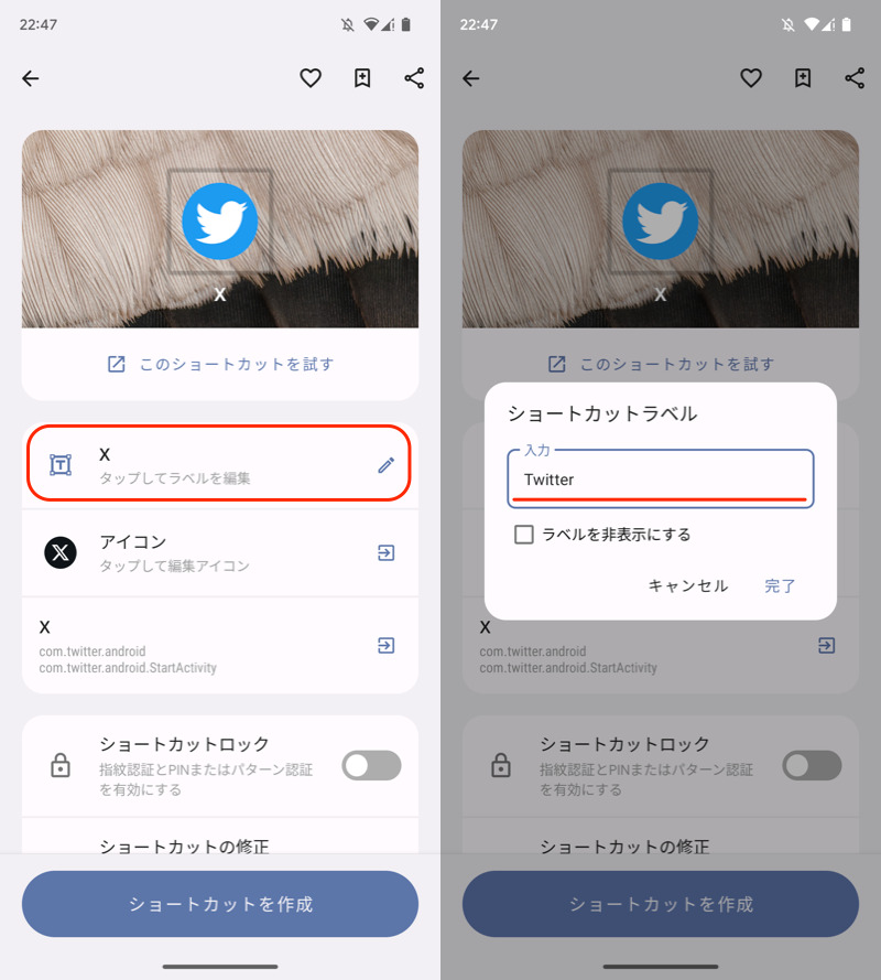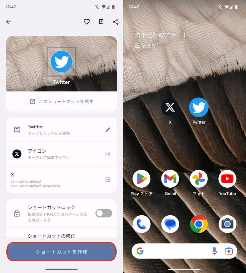 (左)创建快捷方式(右)添加原始 Twitter 图标