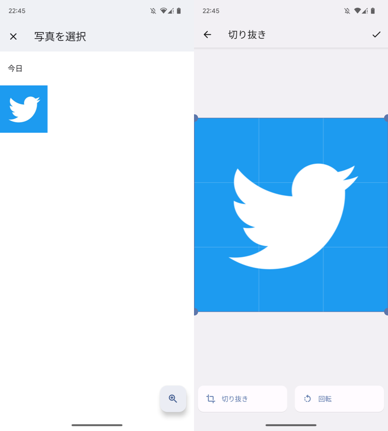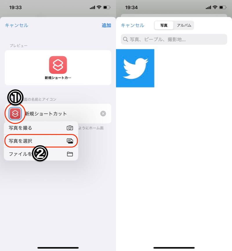 (左)①点击红框→②选择照片(右)选择之前保存的原始Twitter图标图像