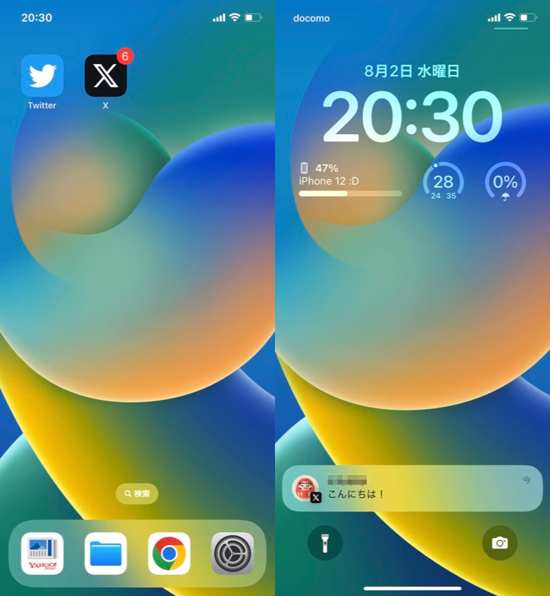 (左)添加 Twitter 图标时未显示通知数量(右)通知中心中显示的示例