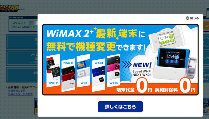 目标受众是“使用 GMO Tokutoku BB 的 WiMAX 2+ “超过 20 个月”的用户,由于我属于这一类别,因此我可以访问会员专用的我的页面``BB船现在,每次您登录``时,都会显示一个活动弹出窗口。