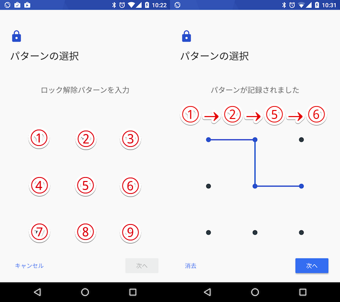 如果您分别使用散布在屏幕上的九个点中的1到9,则图案可以按照通过的点的顺序表示为数字。