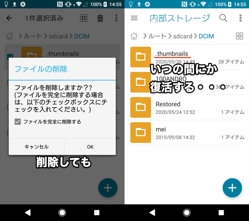 即使我删除了 .thumbnails 文件夹(左),它也会在一段时间后重新出现(右)。