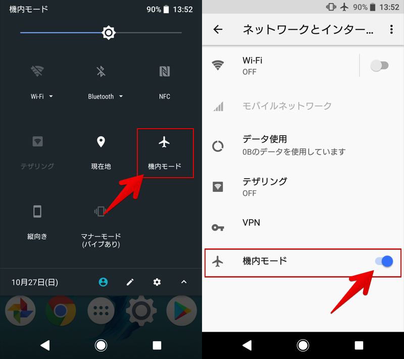 (左)在快速设置(右)打开飞机模式(右)在设置中打开飞机模式
