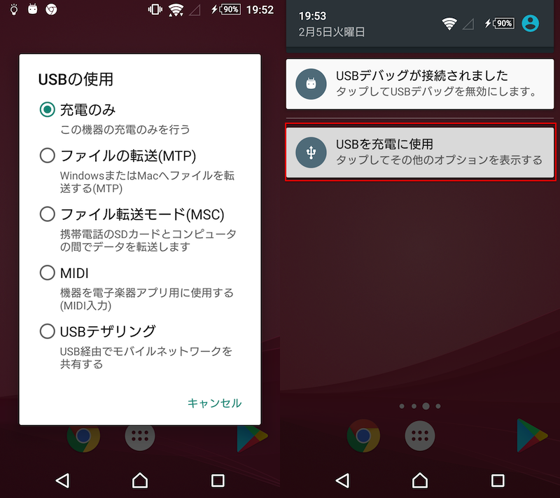 (左)通过USB(右)当前模式在通知区域中显示的菜单自动显示