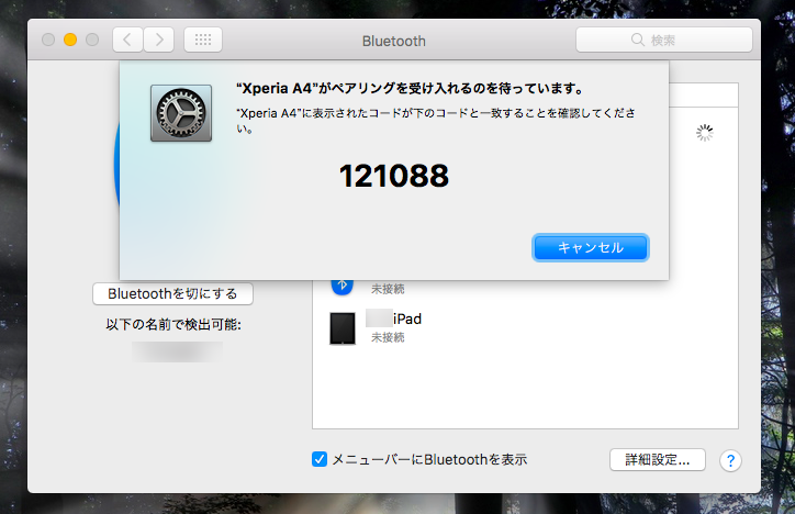 然后,Mac 上将显示一个数字代码,并显示消息“正在等待 Xperia 接受配对”。