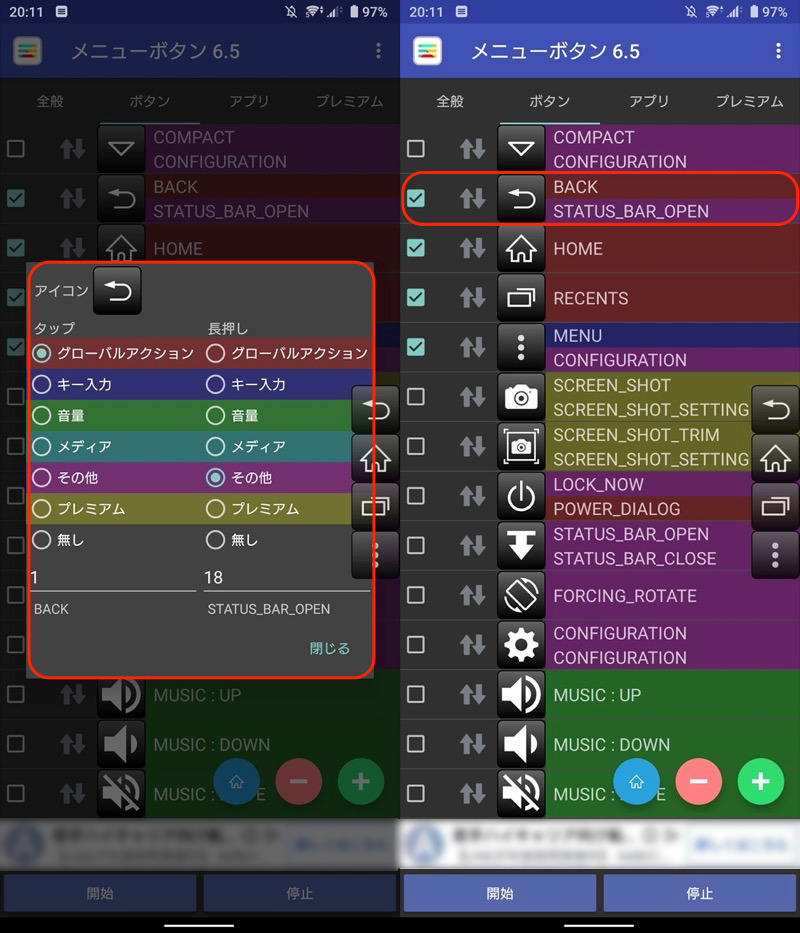 如果您从“按钮”选项卡中检查每个功能,则会添加一个新的浮动按钮。