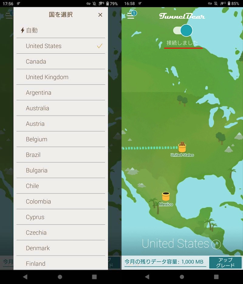 (左)从列表中选择美国 (右)如果出现“已连接”则OK