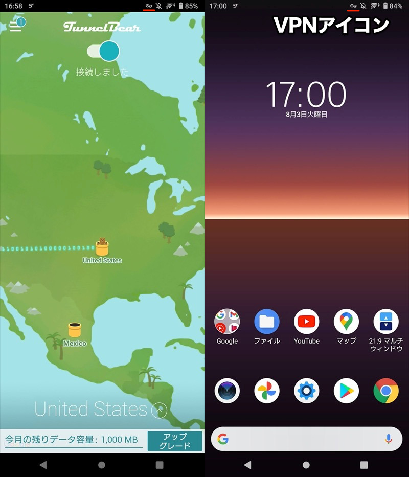 (左边)使用状态栏中显示的(右)VPN 图标的示例