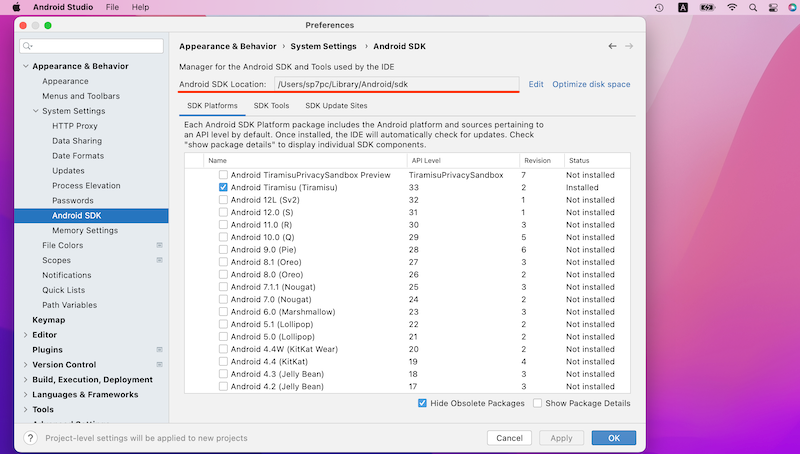 左窗格系统设置→安卓软件开发工具包检查“Android SDK Location”中显示的路径。