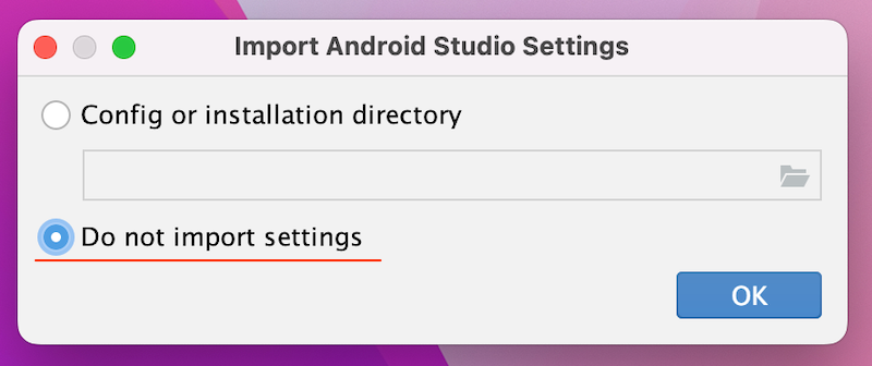 当您打开 Android Studio 时,作为继续初始设置的一种方式,不导入设置选择。