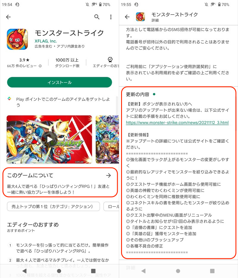 显示《怪物弹珠》更新详细信息的示例。
