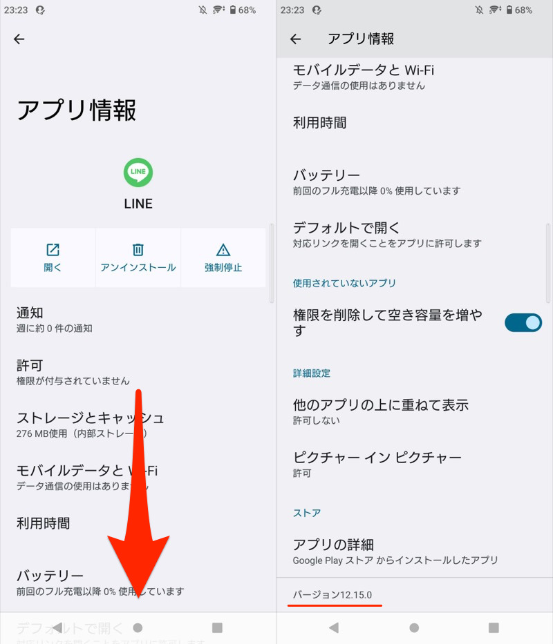 如果向下滚动(左),您可以看到 LINE 应用程序的当前版本是 12.15.0(右)。