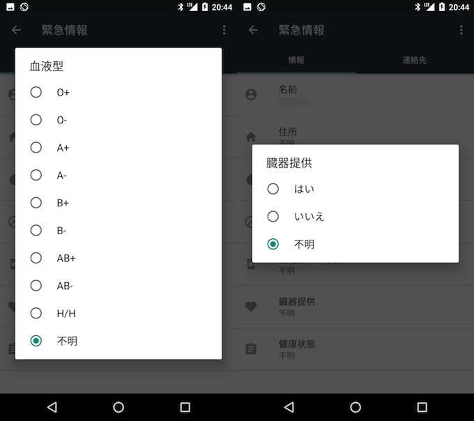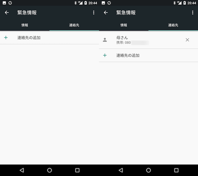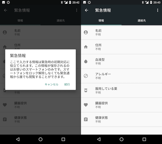 紧急信息页面大致由“信息”选项卡和“联系方式”选项卡组成,在每个项目中输入您想要传达给拿起您的 Android 智能手机的第三方的信息。