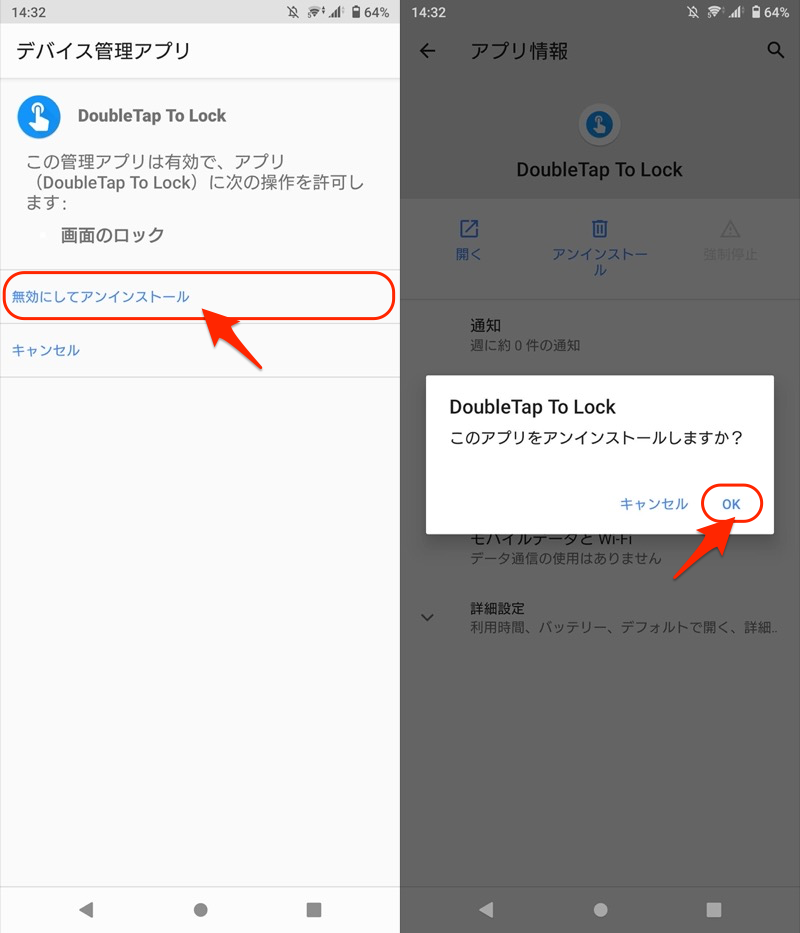 禁用设备管理应用程序(左),然后卸载它(右)。