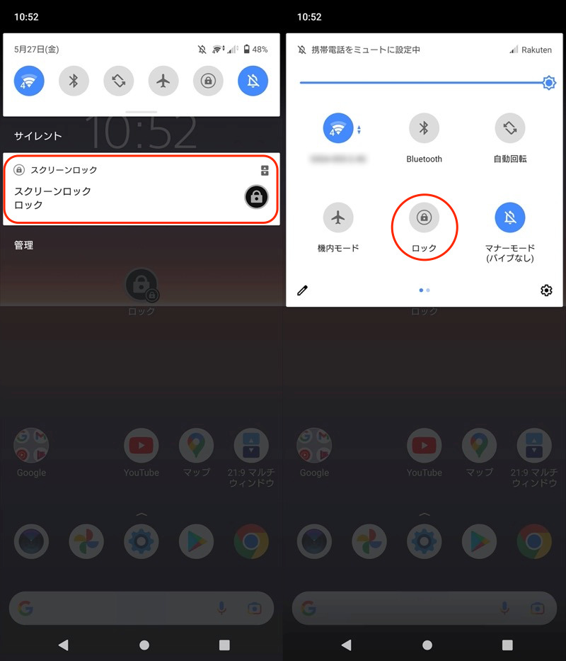 (左)从通知区域锁定(右)从快速设置面板锁定