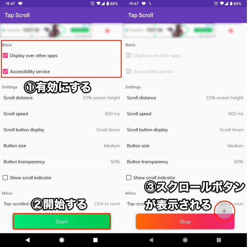 ①授予权限,②点击开始,③将显示滚动按钮。