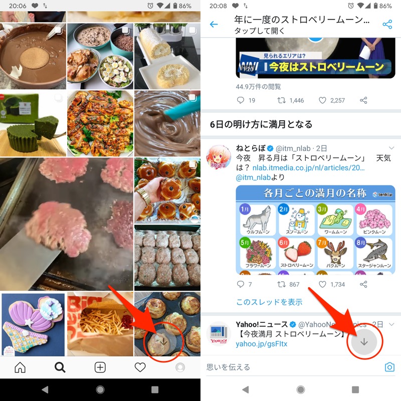 每个应用程序中都会出现一个按钮,包括 Instagram(左)和 Twitter(右)。