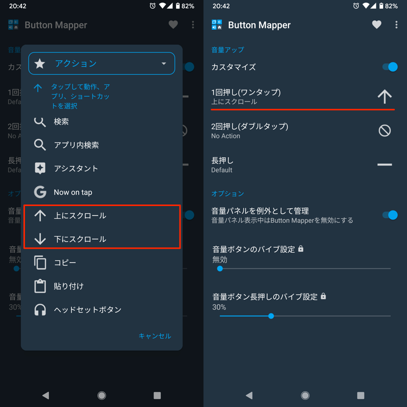 (右)将“向上滚动”分配给单击音量增大键的示例。