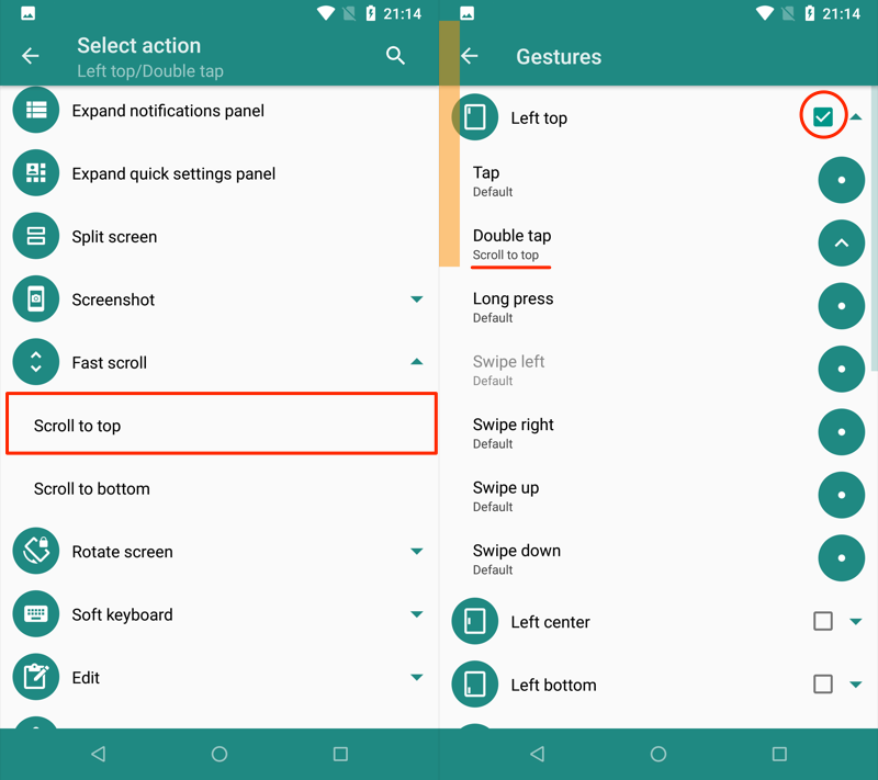 (左)将“滚动到顶部”放置在左上方的示例(右)检查设置的手势以启用它