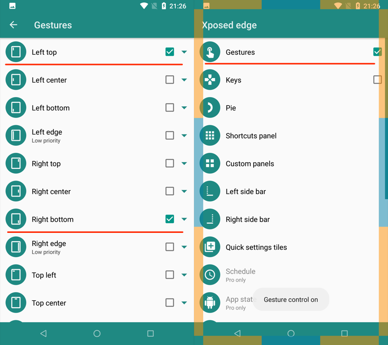 (左)左上和右下均已设置(右)手势本身也已检查