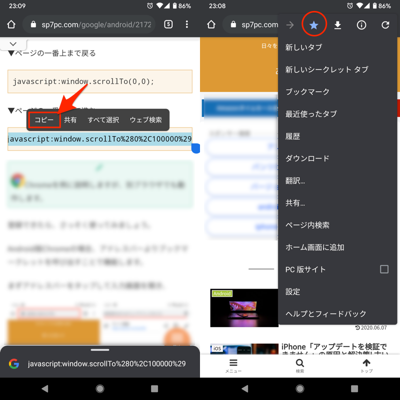 (左)复制小书签(右)您可以通过点击 Chrome 菜单中的 ☆ 图标将其注册为书签