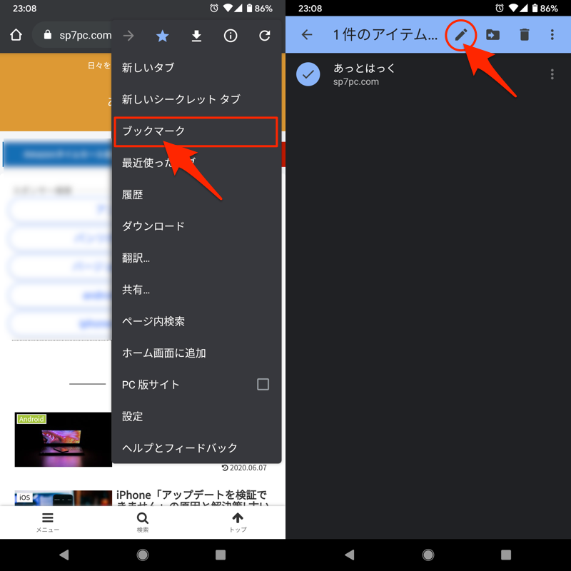 然后从 Chrome 菜单书签打开它并长按您刚刚添加的书签。