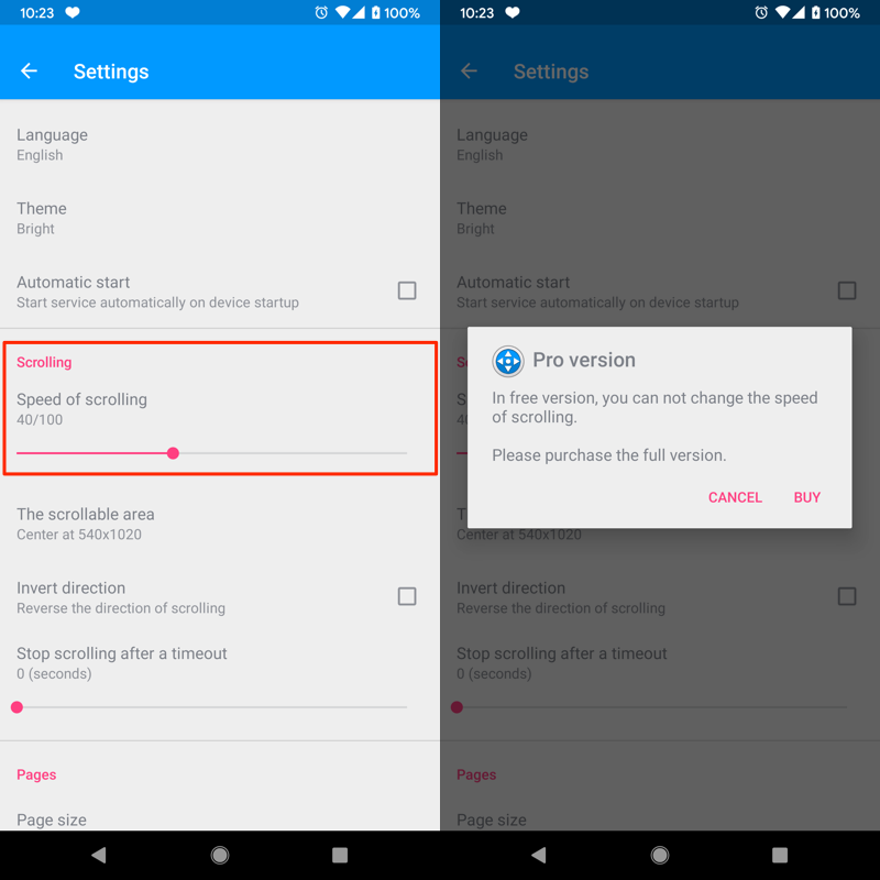 (左)您可以在菜单中的“设置”→“滚动”中调整速度(右)无法与免费版本一起使用