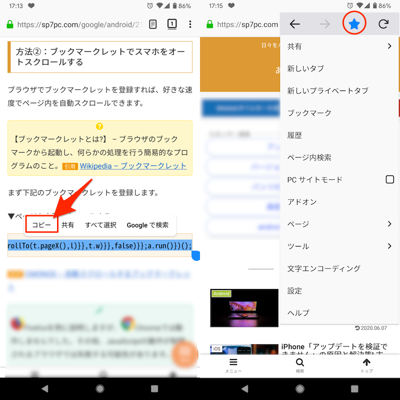 (左)复制书签(右)您可以通过点击 Firefox 菜单中的 ☆ 图标将其注册为书签。