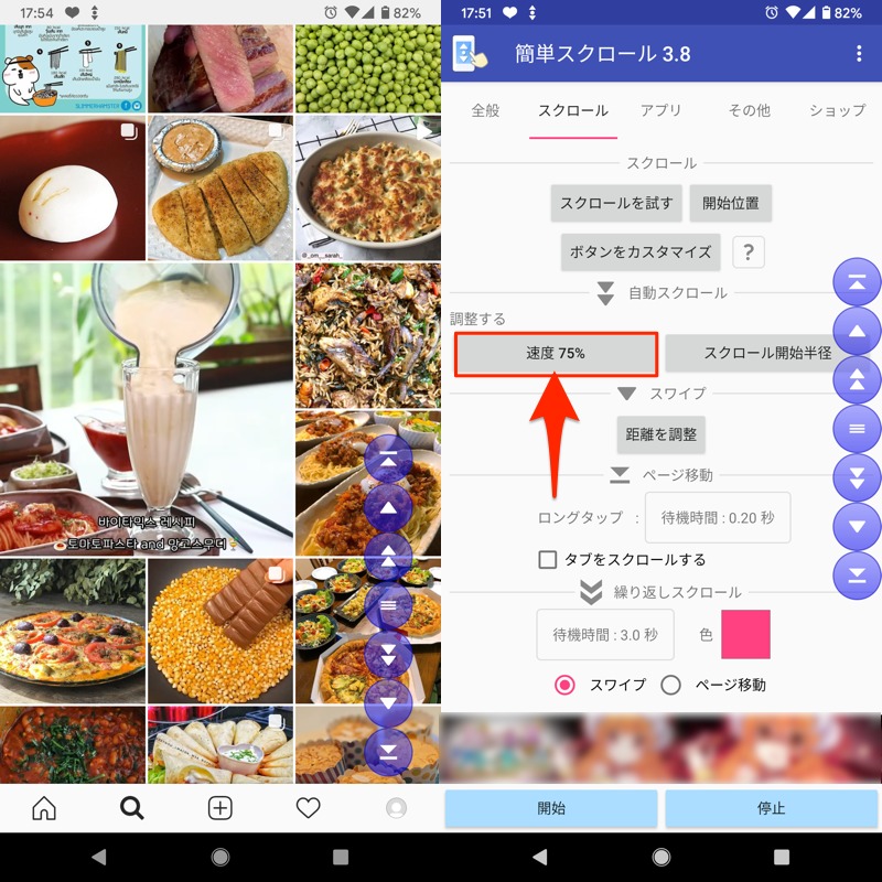 (左)在 Instagram 上控制轻松滚动的示例(右)即使在免费版本中也可以调整自动滚动速度