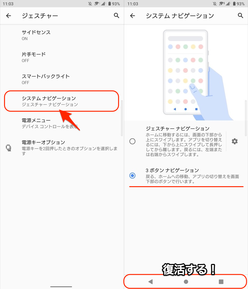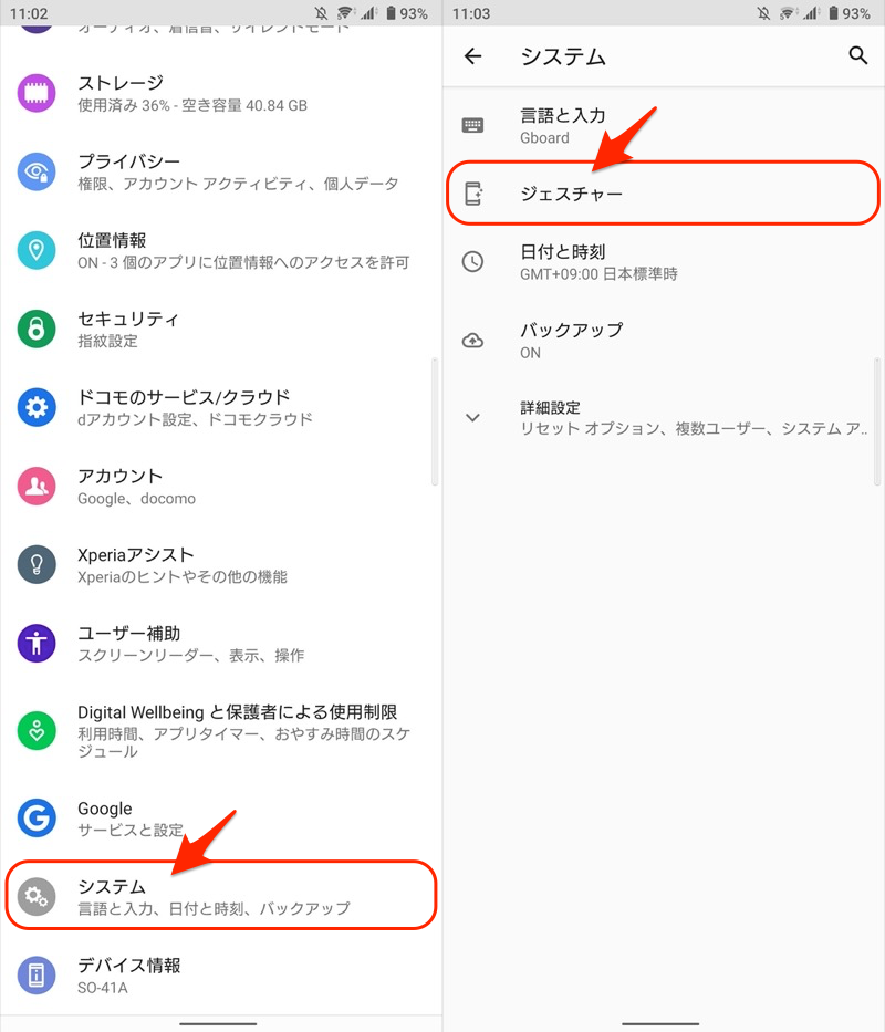 例如,对于 Xperia 10 II (Android 11),系统→手势并继续,