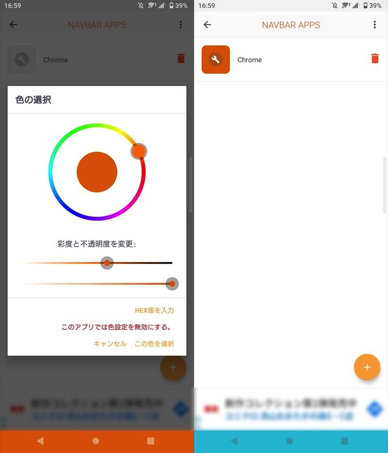 选择颜色(左)后,应用程序将固定为该颜色(右)。