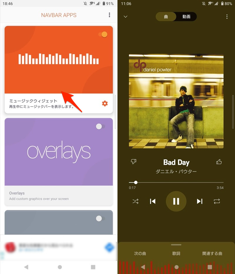 当您检查音乐小部件(左)时,可视化工具将出现在导航栏(右)上。