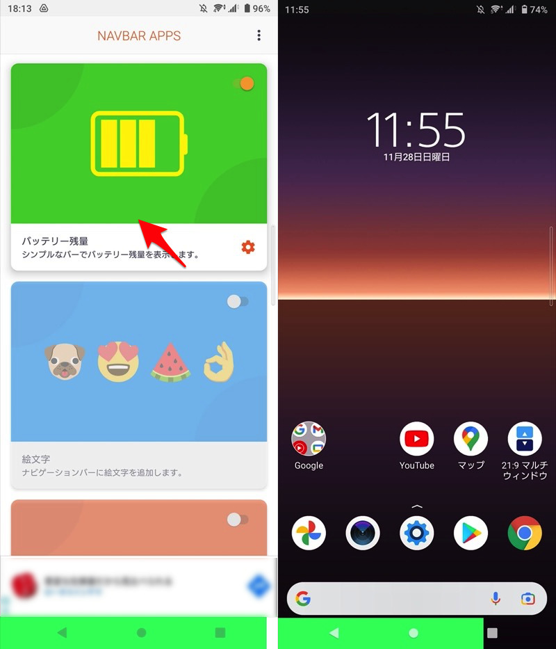 当您检查剩余电池电量(左)时,导航栏中会出现一个指示剩余电池电量的条(右)。