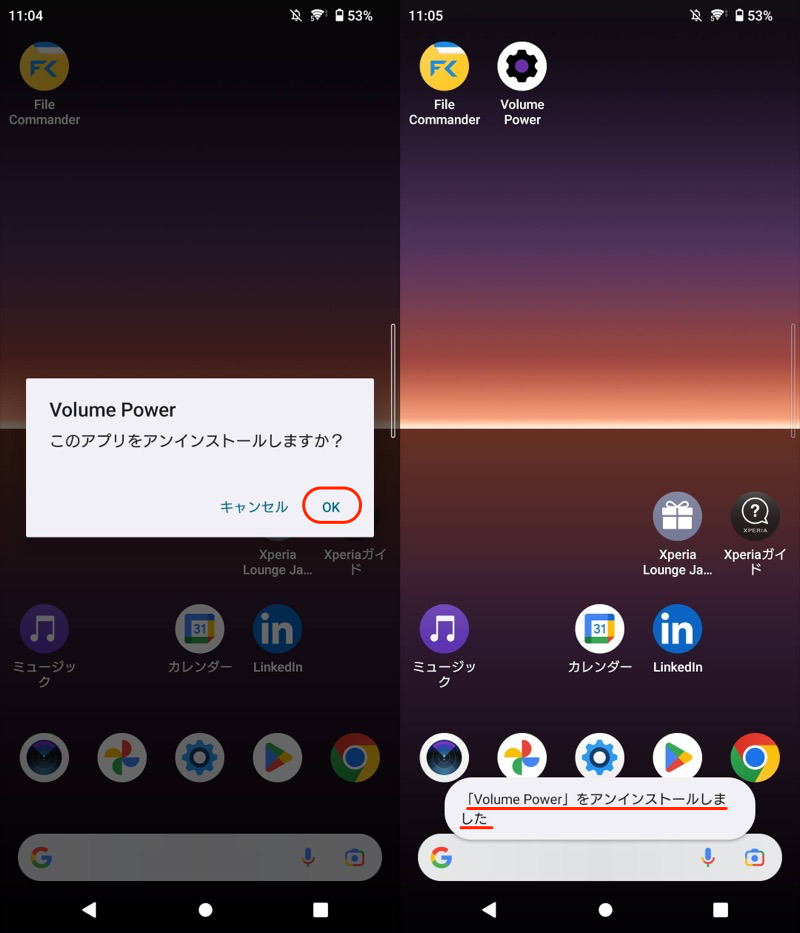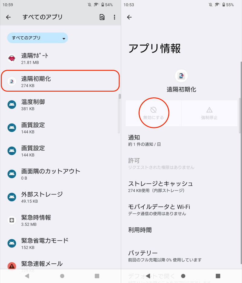 (左)禁用 Xperia Assist(右)删除 docomo Application Manager