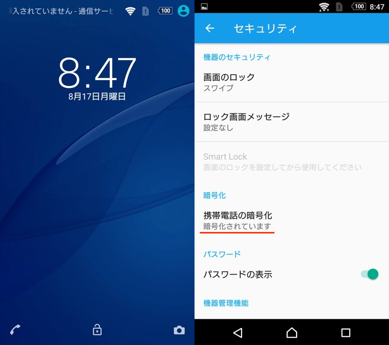 我们以 Xperia Z3(Android 6.0.1)的屏幕为例,默认情况下禁用加密。