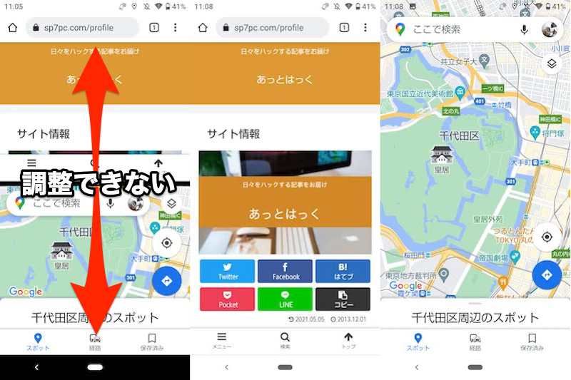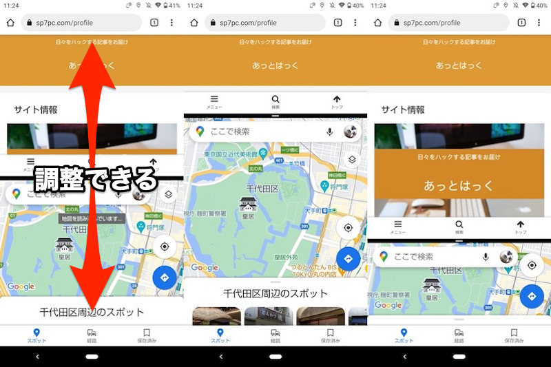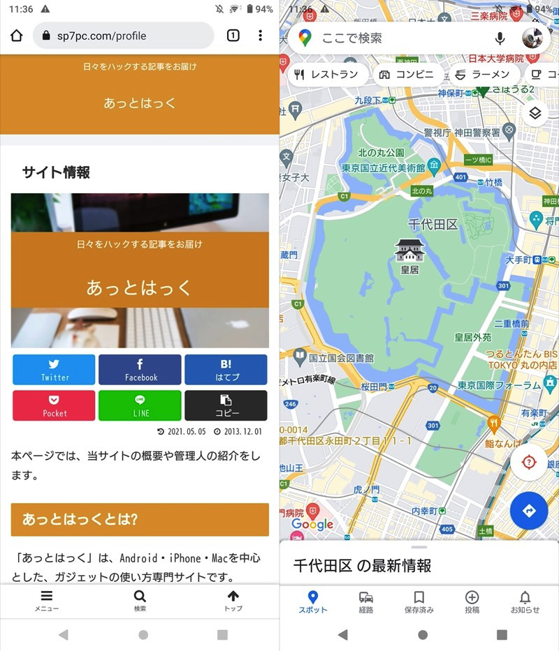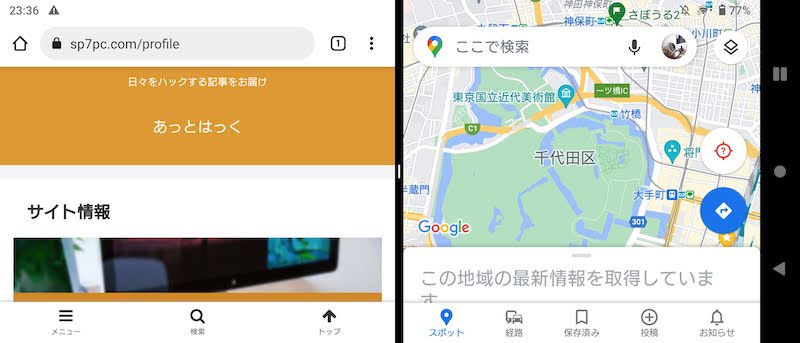 以横向方式在 Chrome(左)和 Google 地图(右)之间分割屏幕的示例。