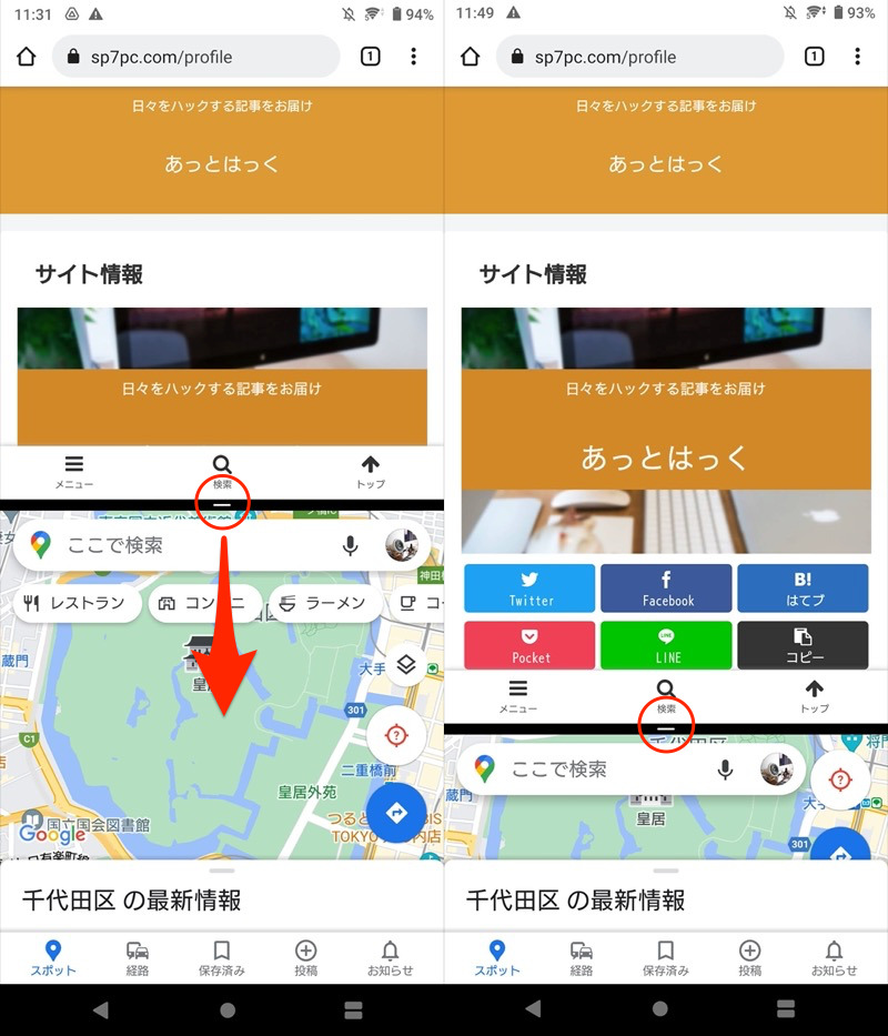 (左)将 Chrome 保留在顶部屏幕的示例(右)将 Google 地图保留在底部屏幕的示例