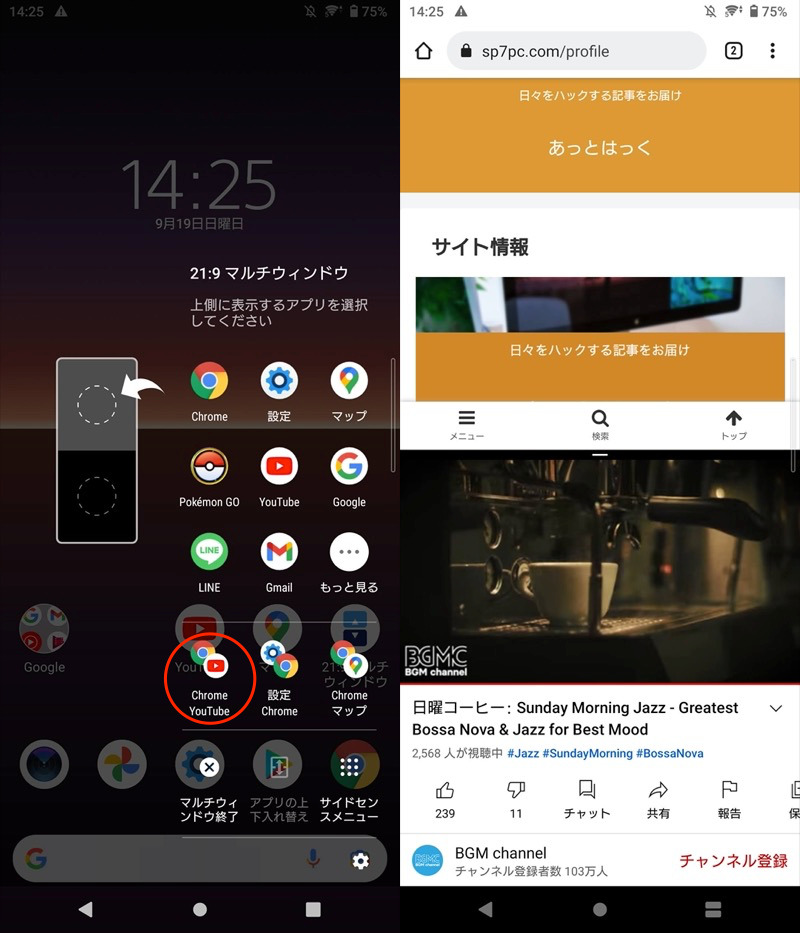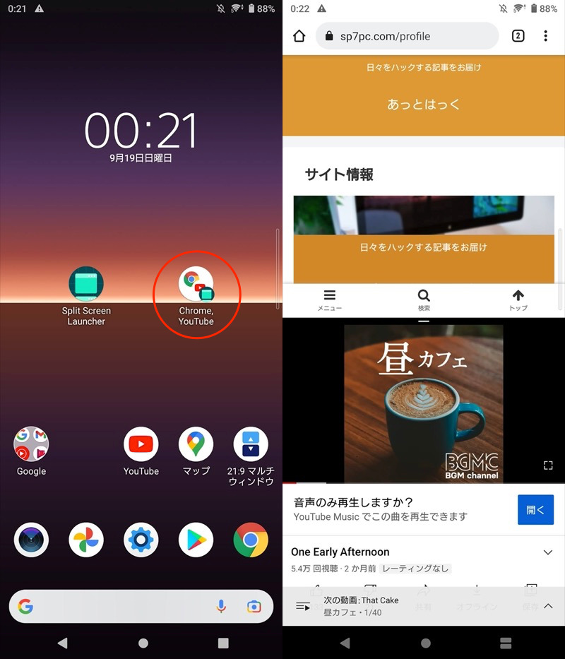 配对的 Chrome 和 YouTube 可以自动拆分和显示的示例。