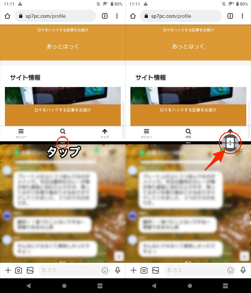 Chrome(上)和 LINE(下)之间的分屏示例。