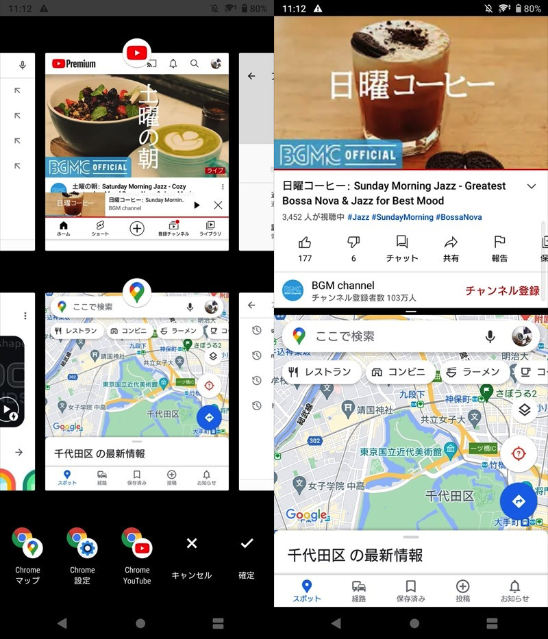 (左)应用程序切换画面(右)YouTube 和 Google 地图之间的切换示例