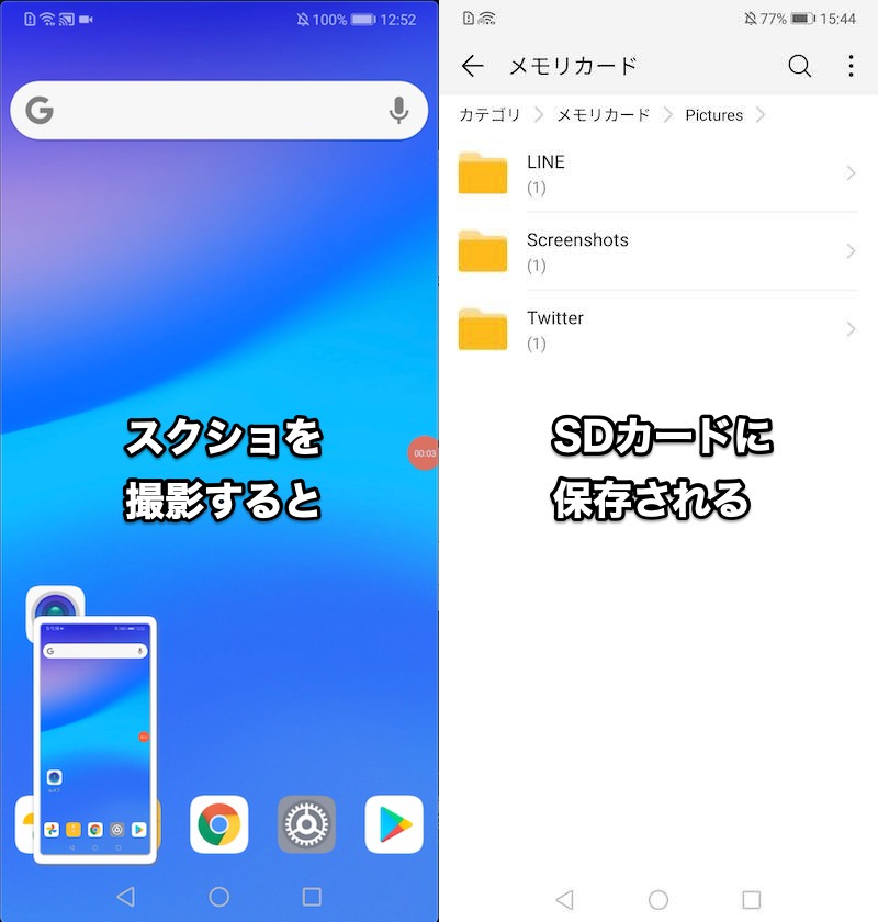 (左)配置屏幕的示例(右)屏幕截图图像自动移动到 SD 卡上的“图片”的示例