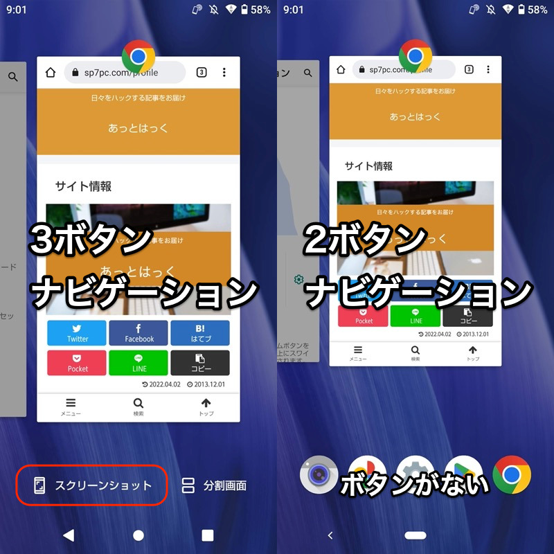 (右)使用两键导航时,多任务屏幕上没有屏幕截图按钮。