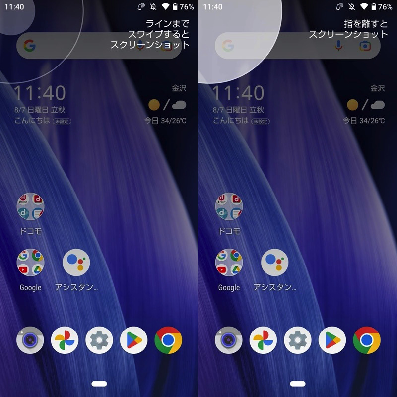 您可以将手指放在屏幕边缘(左)并沿对角线向下滑动(右)来拍照。