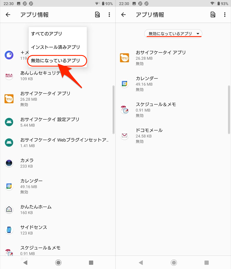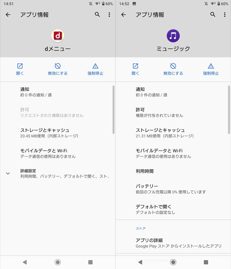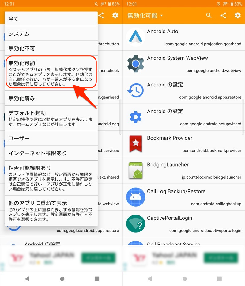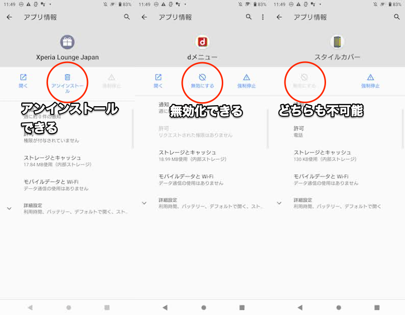 例如 Xperia Assist(左)和 docomo Application Manager(右)。 “禁用”菜单呈灰色且无法选择。