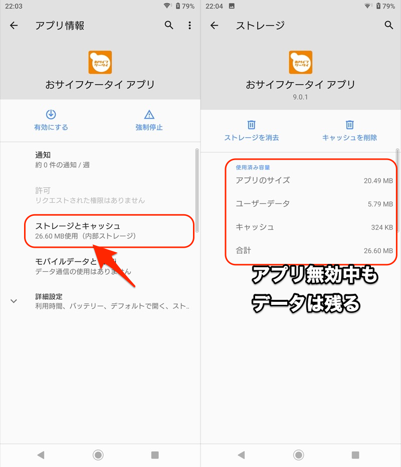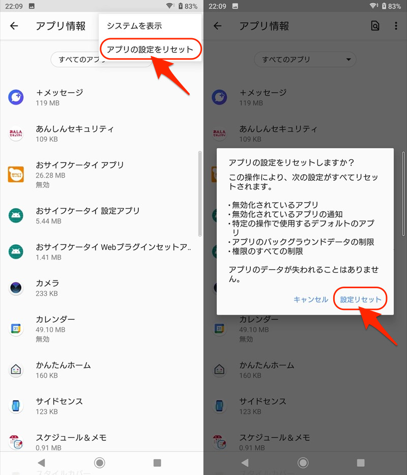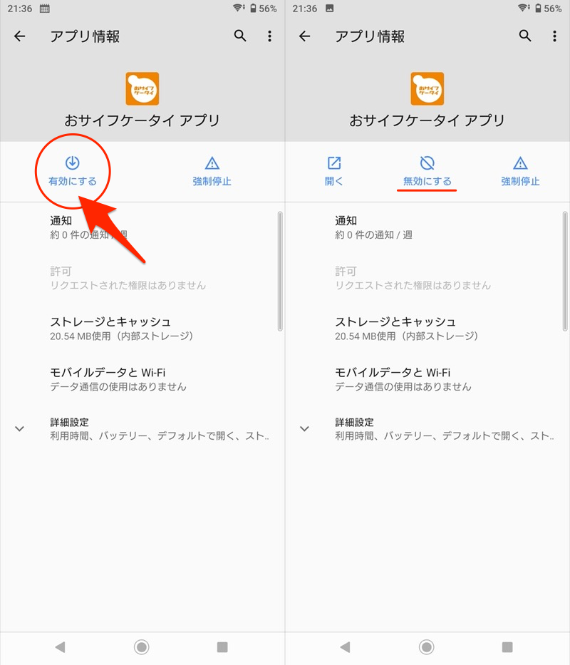 将 Osaifu-Keitai 应用程序恢复到原始启用状态的示例。