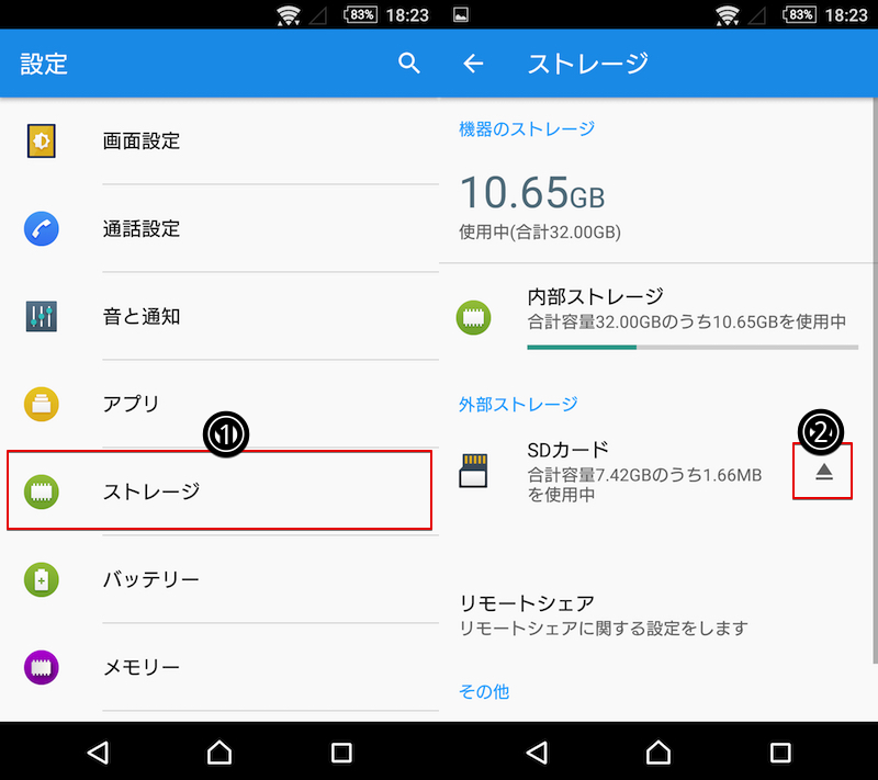 例如,对于 Xperia Z3 (Android 6.0.1),进入“设置”→“存储”,然后点击 SD 卡▲图标。