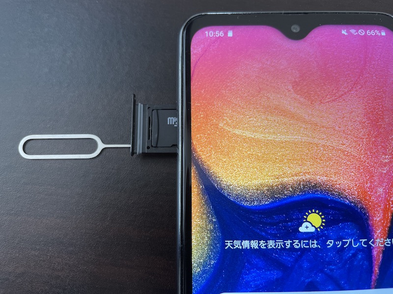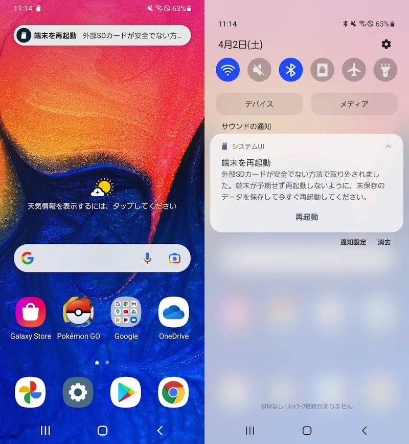 Galaxy A20 的示例。您需要根据取出 SIM 卡时出现的消息手动重新启动设备。
