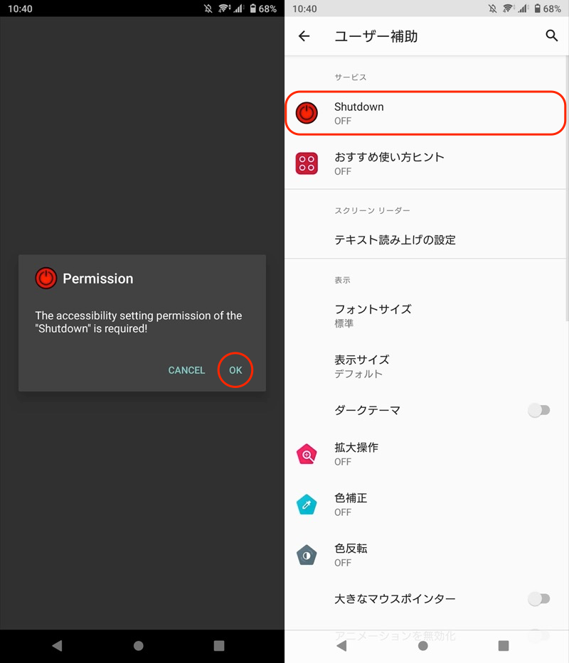 从“关机”顶部屏幕(左),打开辅助功能设置(右)。