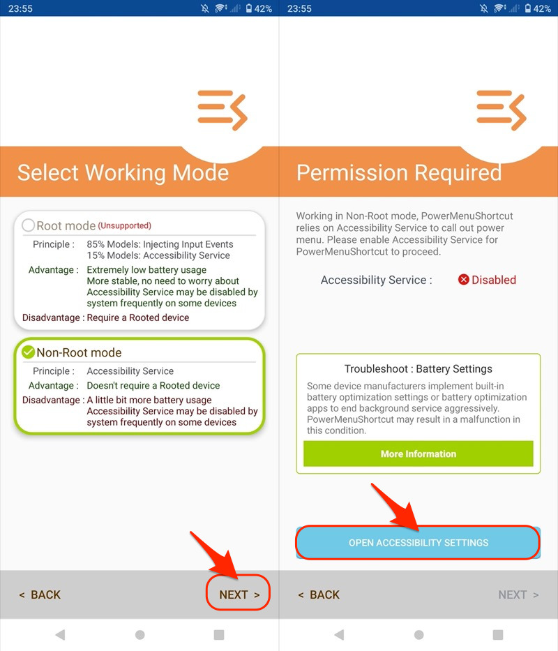 (左)选择免Root模式(右)打开OPEN ACCESSIBILITY SETTINGS